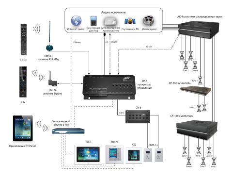 Матричний комутатор-підсилювач і 16-ти канальний підсилювач потужності на одному шасі, орієнтовані на розподіл аудіо в 8 зонах з отриманням сигналу з джерел: плеєрів, ресиверів, тюнерів, по 8 аналогових або 4 RJ45 портах (кабель Сат5). Як і RTI AD-4x, комутатор RTI AD-8x розподіляє по зонах стереосигнал з вихідною потужністю 25 Вт на кожен канал з автономним для кожної зони регулюванням гучності і тембру. Система аудіорозподілу, для всіх пультів RTI, 8 зон, 8 джерел, контроль через: IP, RS 232 та ІЧ порти, вага 5 кг, вага 10,9 кг, ВШГ 133*432*375.