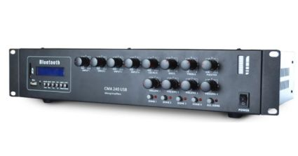 CMB-240 Мікшер / підсилювач. Це 6-ти зонний, трансляційний підсилювач100V з широким функціоналом і безліччю входів і виходів. Є вбудований програвач MP3 / WMA c USB / SD носія і вбудований FM приймач. Вихідна потужність (Середня): 240 W Вихідна потужність (Max.): 300 W Аудіо-вхід: 2 MIC LINE, 1 LINE (CD / Tuner / Tape / Aux) USB / SD-інтерфейс: MP3 / WMA formats MIC (Опір / Чутливість): 600 Ом / 2.7 mV LINE (Опір / Чутливість): 47k / 100 mV AUX (Опір / Чутливість): 20k / 100 mV CD (Опір / Чутливість): 47k / 570 mV Tuner (Опір / Чутливість): 56k / 300 mV Tape (Опір / Чутливість): 1 k / 1 V Прямі виходи: 4,8,16 Ом / 25,70,100 V Зональні виходи: 6 зони: 100V (ONLY) Pre-out: 600 Ом / 1V Частота: 60Hz-16KHz / ± 3DB EQ Contorl (бас): ± 10DB / 25Hz-160Hz / Центральна частота 60Hz EQ Contorl (ВЧ): ± 10DB / 4kHz-20kHz / Центральна частота 10kHz Співвідношення сигнал / шум: 80 dB (LINE), 60 dB (MIC) Сумарний коефіцієнт гармонійних спотворень Менше 0.5% Головне джерело живлення змінного струму: 110 / 230V 50 / 60hz Розміри: 480 * 380 * 98mm Вага: 9,6 кг