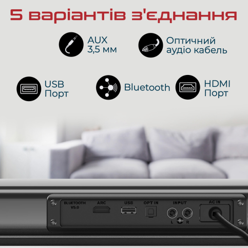 - 5 варіантів з'єднання: Підключай до телевізора, ПК/ноутбука, ігрової консолі, смартфона за допомогою Bluetooth, 3.5 мм AUX, HDMI або оптичного аудіо кабелю. Або програвай музику з флешки через USB порт.