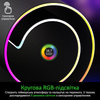 - Кругова RGB-підсвітка: Створить геймерську атмосферу та налаштує на перемогу. У твоєму розпорядженні 9 режимів світіння з можливістю вимкнення й керуванням сенсорною кнопкою.