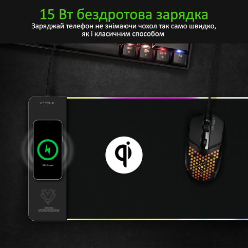 Забудь про маленькі килимки й пов'язані з ними обмеженнями. Відчуй повний контроль над ситуацією й заряджайся прямо під час гри. Vertux RaftPad-Qi змінить твоє уявлення про ергономіку та функціональність ігрової зони!