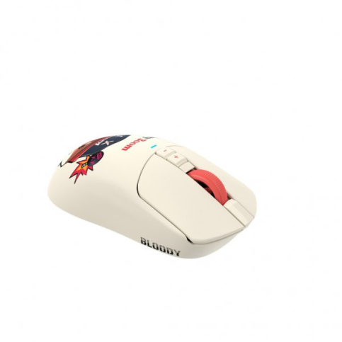 Миша ігрова бездротова Bloody, 2.4 ГГц, вбудований акумулятор, оптична 20000 CPI, сенсор Alpha 20K Engine, біла з малюнком 192х140х50 Китай