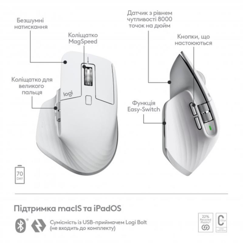 Легенда. У новому втіленні. Зустрічайте MX Master 3S - нове покоління популярної миші. Відчуйте кожну мить робочого процесу завдяки ще більшій точності, тактильній віддачі, продуктивності, безшумним кнопкам та сенсору з роздільною здатністю 8000 точок на дюйм та відстеженням на склі. Відчутно, але майже не чути Уявляємо Quiet Clicks — технологію практично безшумної тактильної віддачі для роботи та творчості. Кнопки Quiet Clicks забезпечують приємне тактильне відчуття при натисканні, але звучать на 90% тихіше за звичайні. (У порівнянні з MX Master 3 рівень звукової потужності при клацанні лівою та правою кнопкою миші MX Master 3S на 90% нижче (при вимірюванні на відстані 1 м)). А в поєднанні з напрочуд тихим електромагнітним колесом прокручування MagSpeed вони дозволять вам працювати максимально зосереджено. 8000 точок на дюйм та відстеження на будь-якій поверхні Миша MX Master 3S оснащена найточнішим і чуйним сенсором нового покоління. Оптичний сенсор з роздільною здатністю 8000 пікселів на дюйм відстежує положення миші практично всюди - навіть на склі. (Товщина скляної поверхні повинна становити не менше 4 мм). А в ПЗ Logi Options+ можна налаштувати чутливість відстеження, задавши відповідне значення для поточного робочого процесу та роздільної здатності монітора. (Потрібно встановити програмне забезпечення Logi Options+ для macOS). Прокручування 1000 рядків за секунду Електромагнітне коліщатко MagSpeed дозволяє керувати переміщенням курсора з точністю до пікселя і прокручувати 1000 рядків на секунду. Крім того, воно працює практично безшумно. Коліщатко виготовлене з механічно обробленої сталі, тому воно дає приємні тактильні відчуття і має достатню вагу для забезпечення відчутної інерції при абсолютно беззвучній роботі. Оптимізуйте робочий процес Працюйте одразу з кількома пристроями та операційними системами, налаштовуйте окремі кнопки, задавайте спеціальні параметри для програм, оптимізуйте майже кожен крок робочого процесу та регулюйте швидкість відстеження в ПЗ Logi Options+. (Потрібно встановити програмне забезпечення Logi Options+ для macOS). Ергономічна форма та комфорт на весь день Ергономічний корпус миші розроблений для ідеальної підтримки долоні та пальців. Текстуровані поверхні дозволяють міцно тримати мишу та керувати нею. Унікальний вигин миші MX Master 3S дає можливість комфортно тримати долоню в більш природному положенні. Оптимально розташовані елементи керування для великого пальця легко доступні та забезпечують швидку та інтуїтивно зрозумілу навігацію. Бокове колесо прокручування повторює природні рухи великого пальця, забезпечуючи плавну та інтуїтивно зрозумілу горизонтальну навігацію.