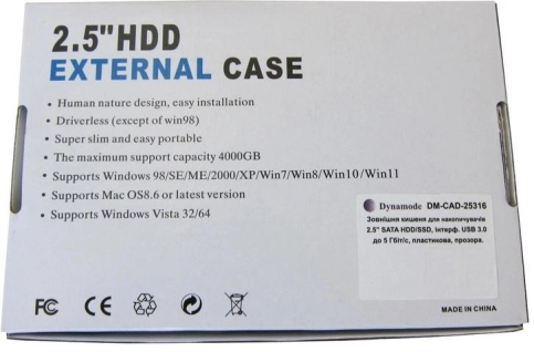 Прозора зовнішня кишеня Dynamode DM-CAD-25316 призначена для 2.5-дюймових дисків SATAI/II/III HDD або SSD і оснащена кабелем USB 3.0 Type-A для підключення. Це ідеальне рішення для розширення можливостей зберігання даних на вашому комп'ютері чи ноутбуку.