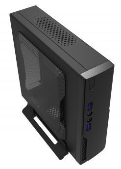 В корпус ПК можна встановлювати материнські плати з форм-фактором Mini ITX. Завдяки сітчастим елементам пил не потрапляє всередину, а повітря циркулює без перешкод. Встановлений блок живлення на 90 Вт дозволить забути про необхідність покупки даного компонента, більше того, він стане справжнім джерелом енергії для безперебійного існування системи. На передній панелі компактно розміщені порти для швидкого підключення периферійних пристроїв та зарядки гаджетів.