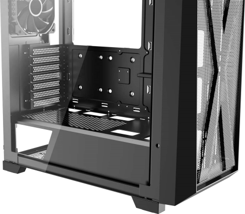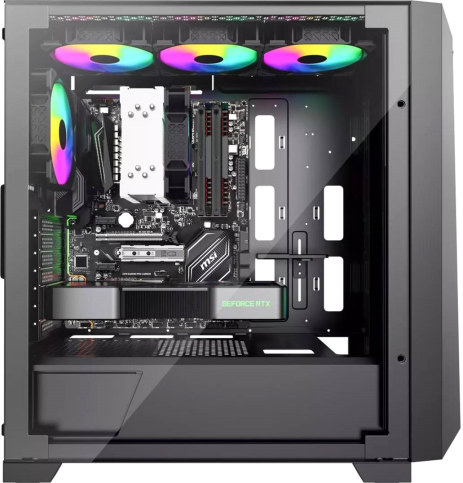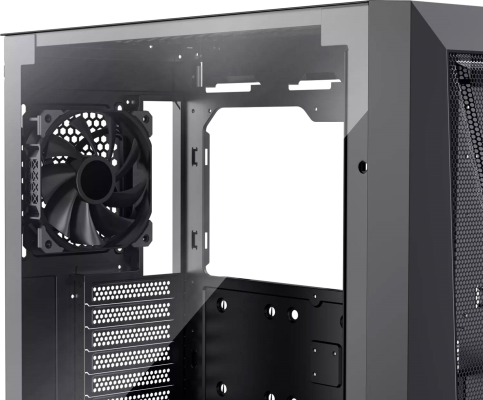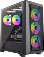 Дизайн стриманий та лаконічний, виконаний в класичному чорному кольорі. Бокова панель прозора, тому внутрішні компоненти системи будуть відкриті для огляду. На верхній панелі компактно розміщені порти для периферійних пристроїв, що є дуже зручним при повсякденному користуванні. Яскравий акцент та геймерського шику вносить стильна декоративна RGB вставка на передній панелі.