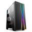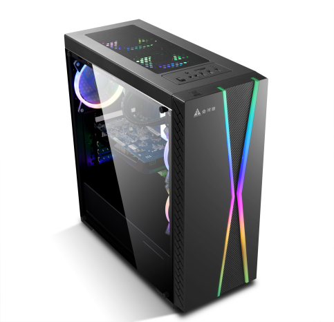 Ігровий корпус Передня панель з RGB стрічкою Надійні високі пластикові ніжки для поліпшення охолодження 1 роз’єм USB3.0 і 1 роз’єм USB2.0, аудіороз’єми Жорстка (сталь SECC 0.5-0.6 мм), чорніння конструкція шасі Оброблені кутові з’єднання Поліпшений захист від електромагнітних завад