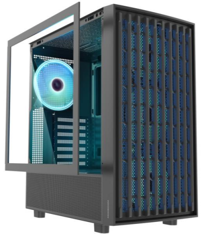 Фронтальна та верхня сітчасті панелі покращують циркуляцію повітря всередині корпусу. Бокова панель із загартованого скла відкриває чудовий огляд встановленої системи. Оптимізований механізм кріплення бокової панелі дозволяє легко її знімати та встановлювати знову. Це робить обслуговування системи надзвичайно простим.