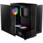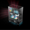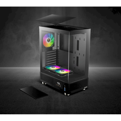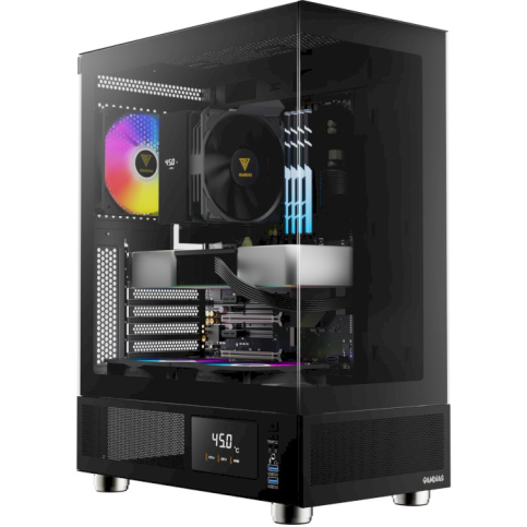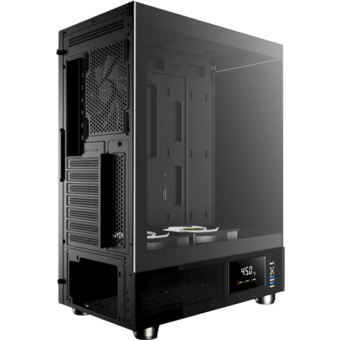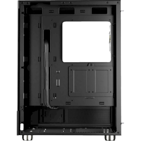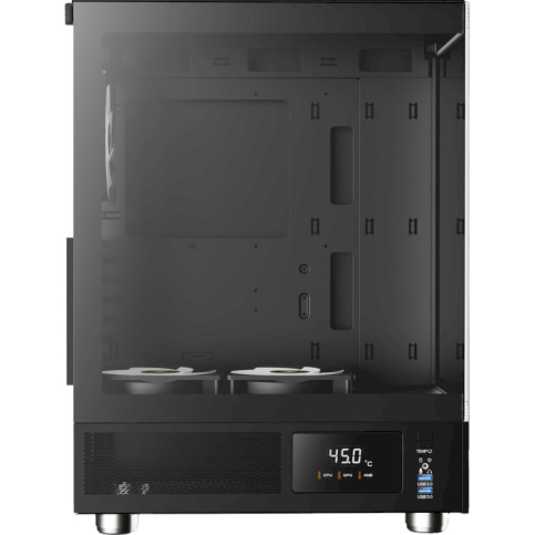 Виріб оснащений трьома 120-міліметровими вентиляторами із яскравою RGB-підсвіткою, які добре впораються із підтримкою оптимальної температури всередині системи. А також своїм яскравим виглядом перетворять простір в справжню геймерську зону. Корпус надійно тримається на спеціальних ніжках, які окрім стійкості не затримуватимуть гаряче повітря. На боковій панелі компактно розміщені порти для периферійних пристроїв, що є дуже зручним при повсякденному користуванні.