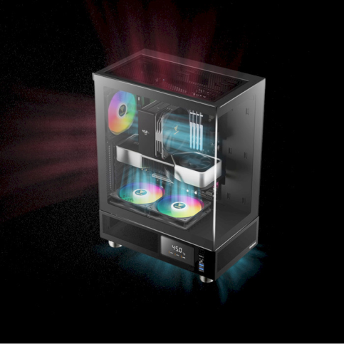 Дизайн пристрою демонструє справжню елегантність, яку підкреслює поверхня чорного кольору та дві скляні стінки: бокову та передню. Вони дадуть змогу спостерігати за роботою внутрішніх компонентів системи, контролювати їх стан та насолоджуватися яскравим виглядом корпусу. Вбудований екран відображає інформацію про стан системи у реальному часі, включаючи температуру ЦП, відеокарти та навколишнього середовища. Керувати екраном можна за допомогою програмного забезпечення ZEUS CAST. Користувачі також можуть перемикатися між режимами CPU/GPU/AMB/OFF через порт введення/виведення.
