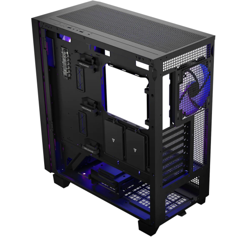 Розсувно-знімний обмежувач інтер'єру є одним з ключових елементів конструкції корпусу Volcano Perun. Регульована по висоті опора для відеокарт дозволяє встановити найсучасніші відеокарти довжиною до 390 мм. Геймери також безсумнівно оцінять можливість їх вертикального монтажу.