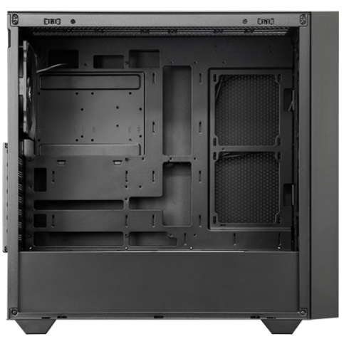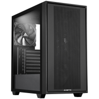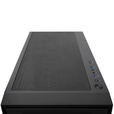 Бічна панель із загартованого скла дозволяє демонструвати внутрішні компоненти, надаючи системі стильного вигляду. Чіткі лінії та чорне матове покриття роблять корпус не лише функціональним, а й естетично привабливим.