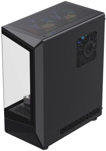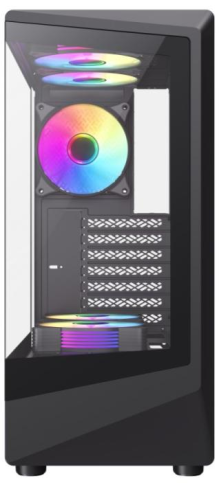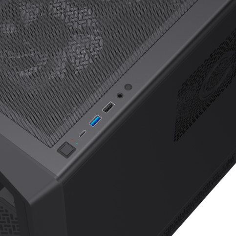 Дизайн вражає прозорими панелями із загартованого скла з оглядом 262° та ARGB-підсвічуванням, які створюють ефектний зовнішній вигляд. Геометричний мінімалізм додає елегантності, роблячи корпус окрасою будь-якого простору. На передній панелі наявні USB-порти та аудіороз’єм, що забезпечують зручний доступ до підключень.