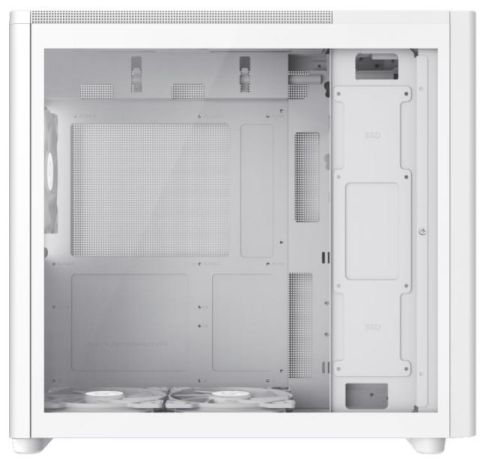 Зручність збірки забезпечується просторим інтер’єром і продуманим кабель менеджментом. На передній панелі розташовані сучасні роз’єми: 2x USB 3.0, Type-C (Gen2) і комбінований аудіороз’єм. Пилозахисні фільтри на верхній, нижній і бічній панелях допомагають підтримувати чистоту всередині.