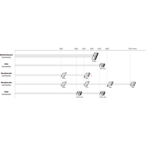 Конектори: 1 x MB 24 (20+4) pin, 500мм; 1 x CPU (4+4) pin, 550мм; 2 x (SATA+Molex), (300+150мм); 1 x (2хSATA+Molex), (300+150+150мм); 1 x PCI-E (6+2) pin, (400+150мм)