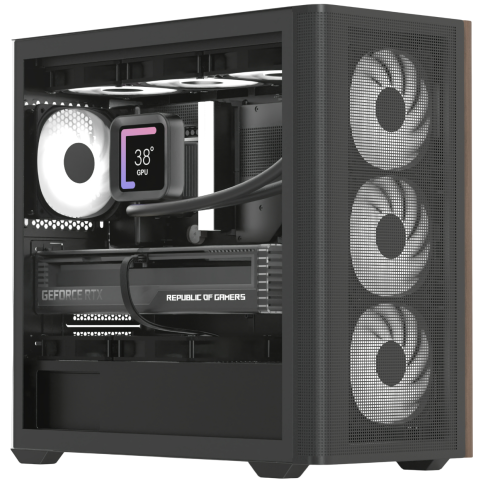 Відчуйте поєднання стилю та функціональності в корпусі AeroCool D301A з модною сітчастою передньою панеллю з дерев’яним акцентом і міцною конструкцією SPCC. Ідеально підходить для потужних конфігурацій, підтримує рідинне охолодження довжиною до 360 мм і графічні процесори довжиною до 410 мм. Витончений і потужний Витончений дизайн можна побачити зсередини та ззовні, при цьому в ньому можна розмістити висококласні компоненти для ігор або інших потреб. Модний і легкий дизайн Сітчаста передня панель не лише додає стильного вигляду, але й забезпечує оптимальну вентиляцію повітря для кращої ефективності охолодження. Елегантно виготовлений Вигнуті краї та повністю сітчаста передня панель підкреслюють орієнтовану на потік повітря конструкцію D301A. Природний дизайн Відкиньтеся на спинку крісла та насолоджуйтеся одним із наших перших корпусів для ПК з дерев’яним акцентом, що має вишуканий вигляд, розроблений для створення природної атмосфери на вашому робочому столі. Великий повітрозабірник Повітрозабірник спеціально розроблений з великими вентиляційними отворами, щоб ваші компоненти залишалися прохолодними. Приховайте кабелі від сторонніх очей Підтримує материнські плати ASUS і MSI формату MicroATX з роз’ємами, спрямованими назад, щоб сховати кабелі та надати збірці елегантного вигляду. Чудова підтримка охолодження Завдяки 11 слотам для вентиляторів і 360-міліметровій підтримці рідинного охолодження зверху та спереду, D301A надає вам свободу для повного використання потенціалу вашої системи охолодження для досягнення оптимальної продуктивності. Легко керуйте своїми чотирма попередньо встановленими вентиляторами ARGB за допомогою 5-портового концентратора PWM ARGB, що дає вам повний контроль над візуальною естетикою вашої системи.
