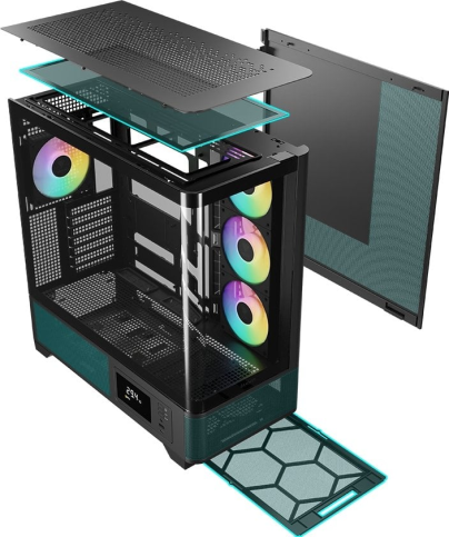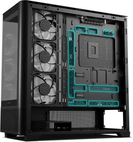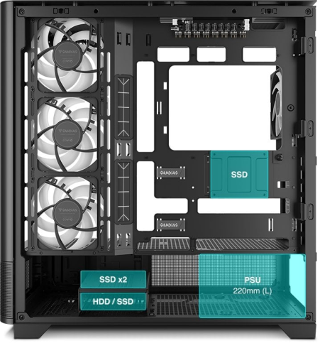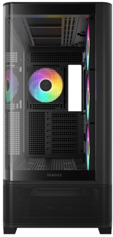 Корпус GAMDIAS ATLAS P2 CG — це середньорозмірний Mid-Tower, який поєднує сучасний дизайн і функціональність для створення ефектних ігрових систем. Його ключовою особливістю є суцільна вигнута панель із загартованого скла з кутом огляду 270 градусів, що забезпечує панорамний вигляд внутрішніх компонентів без рамок і перешкод. Такий акваріумний дизайн підкреслює естетику збірки, дозволяючи демонструвати апаратне забезпечення.