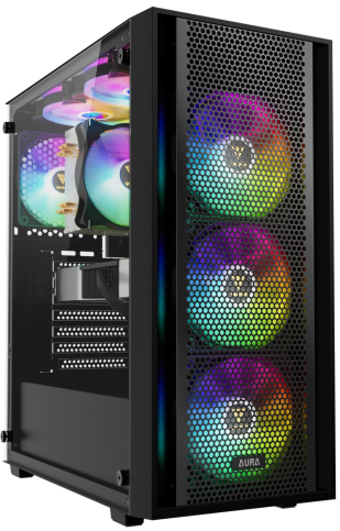 Панель введення-виведення розташована у верхній частині та включає один порт USB 3.0, два порти USB 2.0, аудіороз’єм HD Audio та кнопку скидання, що забезпечує зручний доступ до основних функцій. Чотири вентилятори ARGB створюють яскраве підсвічування.