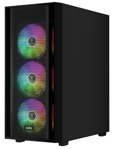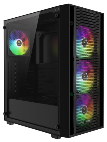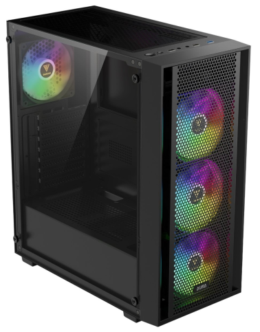 Корпус виконаний у формфакторі Mid-Tower і сумісний із материнськими платами ATX, Micro-ATX і Mini-ITX. Його конструкція виготовлена з міцної сталі SPCC, ABS-пластику та загартованого скла, що забезпечує довговічність і привабливий вигляд. Чорний колір із глянцевими акцентами та панорамна бічна панель із 4-мм загартованого скла дозволяють ефектно продемонструвати внутрішні компоненти, підкреслені чотирма попередньо встановленими 120-мм вентиляторами з ARGB-підсвіткою (три спереду, один ззаду). Сітчаста передня панель із магнітним пиловим фільтром гарантує оптимальний повітряний потік, сприяючи ефективному охолодженню.