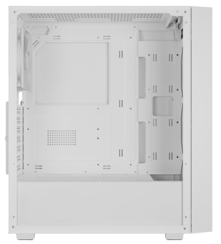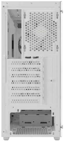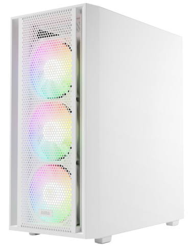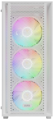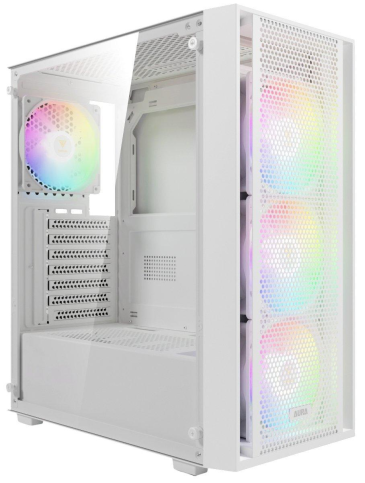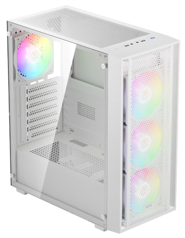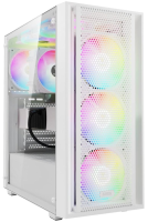 Корпус виконаний у формфакторі Mid-Tower і сумісний із материнськими платами ATX, Micro-ATX і Mini-ITX. Його конструкція виготовлена з міцної сталі SPCC, ABS-пластику та загартованого скла, що забезпечує довговічність і привабливий вигляд. Білий колір із глянцевими акцентами та панорамна бічна панель із 4-мм загартованого скла дозволяють ефектно продемонструвати внутрішні компоненти, підкреслені чотирма попередньо встановленими 120-мм вентиляторами з ARGB-підсвіткою (три спереду, один ззаду). Сітчаста передня панель із магнітним пиловим фільтром гарантує оптимальний повітряний потік, сприяючи ефективному охолодженню.