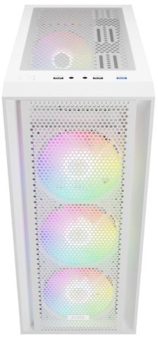 Панель введення-виведення розташована у верхній частині та включає один порт USB 3.0, два порти USB 2.0, аудіороз’єм HD Audio та кнопку скидання, що забезпечує зручний доступ до основних функцій. Чотири вентилятори ARGB створюють яскраве підсвічування.