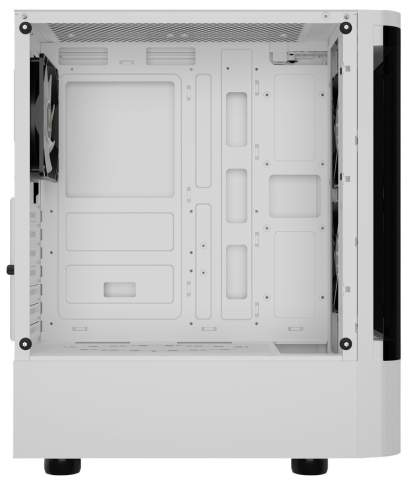 Передня панель I/O містить 2xUSB 2.0, 1xUSB 3.0, аудіопорти та кнопку керування підсвічуванням. Завдяки безгвинтовому монтажу скляних панелей складання спрощується.