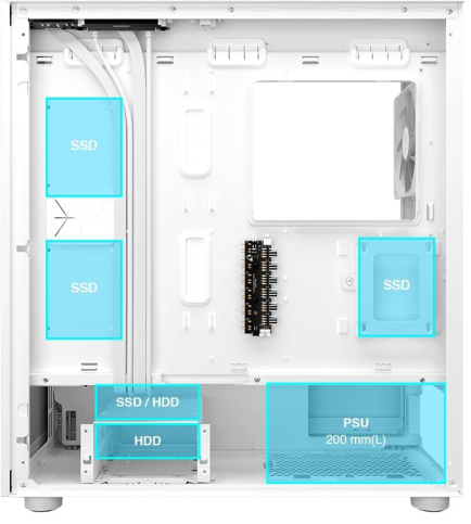 Щодо сумісності, TALOS M3 MESH підтримує материнські плати формату E-ATX, ATX, Micro-ATX і Mini-ITX, відеокарти довжиною до 390 мм і блоки живлення до 200 мм. Це забезпечує гнучкість під час складання потужних систем. Корпус має 7+3 слоти розширення, що дозволяє встановлювати додаткові карти. Для зручності кабельного менеджменту передбачено достатньо місця за задньою панеллю, а також спеціальний відсік для приховування надлишкових кабелів біля блока живлення.