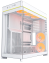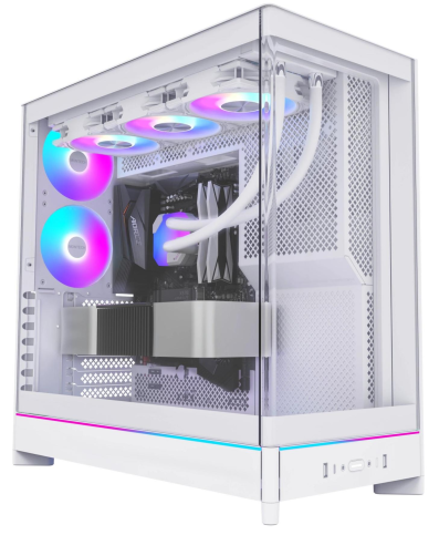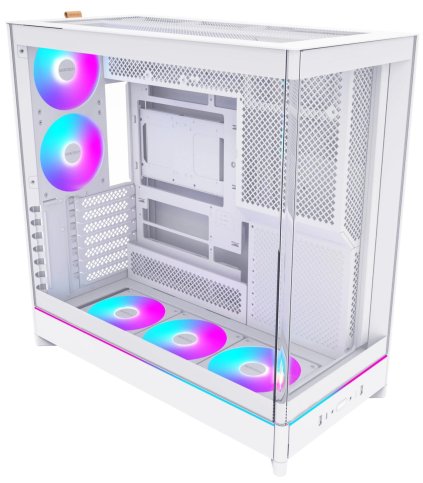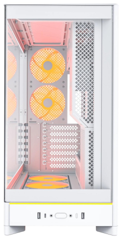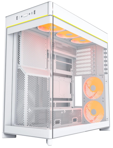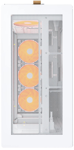 Передня частина корпуса оздоблена вигнутою на 8° скляною панеллю, що не тільки підкреслює сучасний стиль, а й надає широкий панорамний огляд на внутрішнє оснащення ПК. Таке оформлення мінімізує візуальні перешкоди та додає преміальності зовнішньому вигляду.