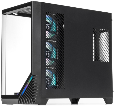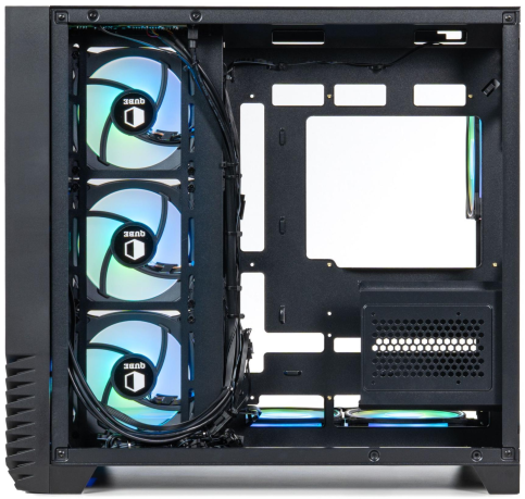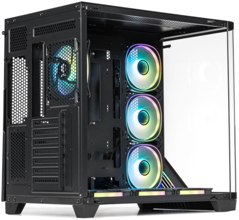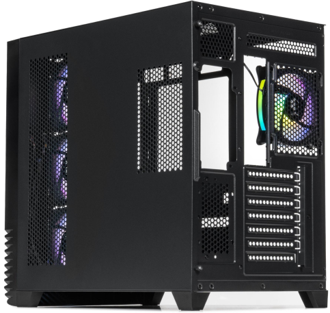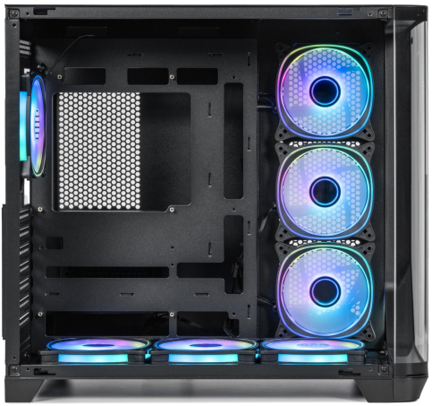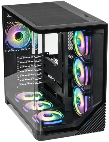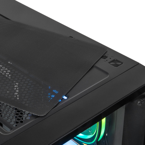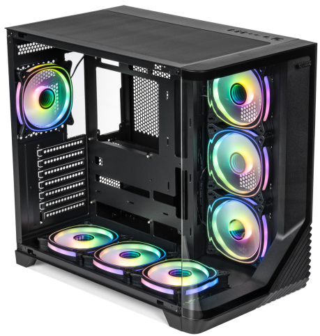 У комплекті вже встановлено сім 120-мм ARGB-вентиляторів. Це забезпечує відмінну циркуляцію повітря та яскраве освітлення, яке додає системі унікального вигляду. На верхній панелі розташовані зручні роз’єми: один USB 3.0, два USB 2.0, а також аудіовходи для навушників і мікрофона. Максимальна висота процесорного кулера становить 165 мм, а довжина відеокарти може досягати 410 мм, що дозволяє встановлювати потужні компоненти.
