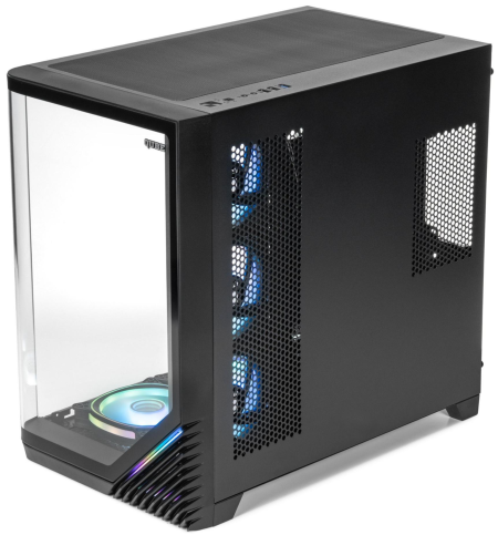 Корпус виготовлений із міцної сталі товщиною 0.5 мм, а краї ретельно оброблені, щоб виключити ризик порізів під час складання. Передня та бокова панелі зроблені із загартованого скла, що дозволяє милуватися компонентами та підсвіткою всередині.