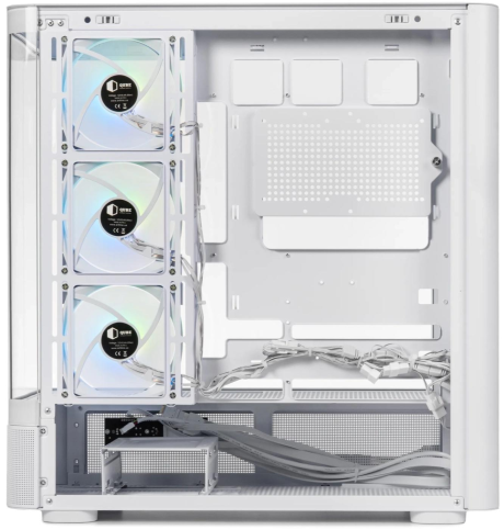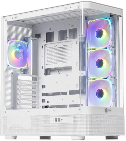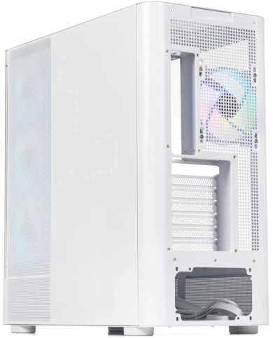 Корпус постачається без блоку живлення, але вже має чотири попередньо встановлені 120-мм вентилятори, які забезпечують ефективне охолодження всередині. Продумане розміщення вентиляторів допомагає підтримувати оптимальний повітряний потік, що важливо для стабільної роботи компонентів під навантаженням.