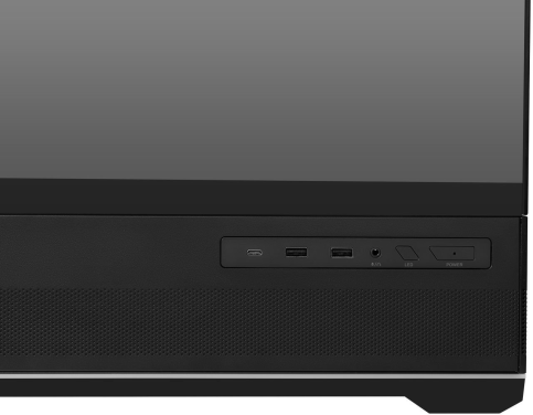 Фронтальна панель MSI MAG Pano 110R PZ включає сучасні роз’єми: один порт USB 20 Гб/с (Type-C), два порти USB 5 Гб/с (Type-A), вхід для мікрофона, вихід для аудіо, кнопку живлення та LED-кнопку для керування підсвічуванням. Єдиний роз’єм для підключення кабелю передньої панелі спрощує підключення до материнської плати MSI, а бічна панель із фіксатором забезпечує швидкий доступ до компонентів.