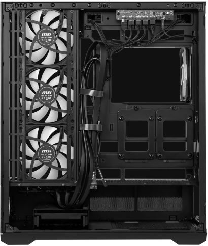 Однією з ключових особливостей MSI MAG Pano 110R PZ є його панорамний дизайн із панелями із загартованого скла, які забезпечують безперешкодний огляд внутрішніх компонентів. Корпус оснащений попередньо встановленими трьома ARGB-вентиляторами з реверсивними лопатями на бічній панелі та одним ARGB-вентилятором на задній панелі, що не лише оптимізує потік повітря, але й створює естетично привабливий вигляд завдяки підтримці 18 режимів підсвічування, керованих через LED-кнопку. Плата управління вентиляторами підтримує до п’яти ARGB PWM-вентиляторів, що спрощує кабель-менеджмент і дозволяє налаштувати підсвічування за допомогою технології MSI Mystic Light.