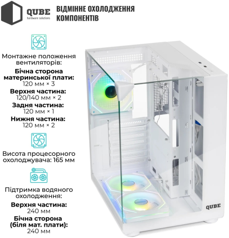 Qube Aquarium — це стильний і сучасний комп’ютерний корпус, призначений для створення ефектних геймерських або робочих ПК. З прозорою бічною панеллю з гартованого скла він поєднує естетику "акваріумного" дизайну, гарну вентиляцію та підтримку сучасних компонентів, що робить його ідеальним для ентузіастів, які прагнуть продемонструвати внутрішні компоненти своєї системи.