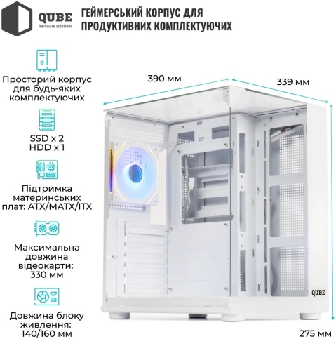 Qube Aquarium — це стильний ATX-корпус із прозорою бічною панеллю, гарною вентиляцією та підтримкою потужних компонентів, ідеальний для створення ефектних геймерських ПК.