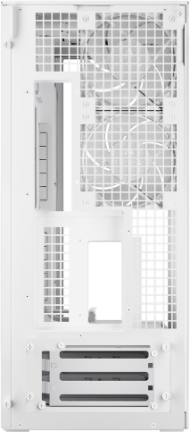 Корпус оснащений п’ятьма попередньо встановленими вентиляторами: двома P12 Pro A-RGB (задня панель, 600–3000 об/хв, потік повітря 77 cfm) і трьома P14 Pro Reverse A-RGB (бічна панель, 400–2650 об/хв, потік повітря 98 cfm). Вони забезпечують ефективне охолодження високопродуктивних компонентів завдяки оптимізованій конструкції з високим повітряним потоком. Корпус підтримує вентилятори 120 мм або 140 мм зверху, збоку та ззаду, а також радіатори розміром 240, 280, 360 або 420 мм для систем водяного охолодження.