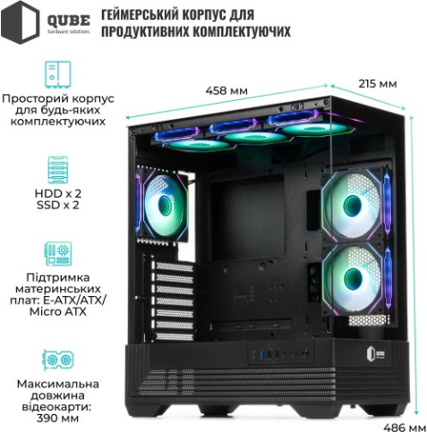 Розміри корпусу роблять QUBE FORT ARGB компактним, але водночас містким. Він ідеально пасує для створення потужного ПК з акцентом на візуальну привабливість і ефективне охолодження.