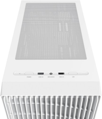 Дизайн корпусу поєднує збалансовану естетику охолодження та продуктивності. Футуристичний стиль із концентричними колами та гармонійними геометричними формами створює ефект глибини та мінімалістичну візуальну динаміку. Навіть панель вводу/виводу продумана до дрібниць — заглиблені кнопки зручні у використанні та запобігають випадковим натисканням, а порти підключення розташовані інтуїтивно для швидкого доступу.