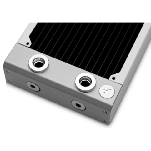 Завдяки товщині 44 мм, поверхневі радіатори EK-Quantumсерії P є абсолютними універсалами, що забезпечують низький рівень шуму та високу продуктивність у всьому діапазоні роботи вентилятора. Оснащені чотирма різьбовими з'єднаннями G1/4", вони забезпечують додаткову універсальність під час планування контуру, а п'ятий порт G1/4", розташований на торцевому баку, є незамінною функцією, коли мова йде про осушення контуру і видалення повітря. Шістнадцять мідних трубок шириною 2 мм по всій довжині радіатора забезпечують оптимальний потік охолоджувальної рідини, не створюючи навантаження на контур охолодження. Високоякісні мідні ребра без жалюзі зі щільністю 18 FPI забезпечують найкращий баланс між тепловіддачею та опором повітря, забезпечуючи оптимальну продуктивність навіть при роботі вентилятора на низькій швидкості. Для досягнення максимальної ефективності охолодження будь-який радіатор EK-Quantum Surface серії P можна використовувати в режимі Push/Pull.