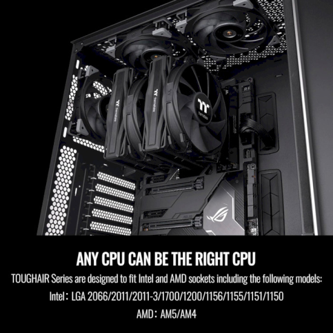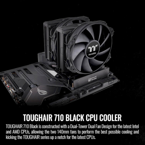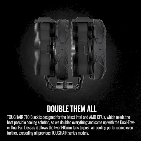 Toughair 710 призначено для новітніх процесорів Intel і AMD, яким потрібне найкраще рішення для охолодження, тому Thermaltake подвоїв усе і придумав конструкцію Dual-Tower Dual Fan Design; вона дає змогу двом 140-мм вентиляторам ще більше збільшити продуктивність повітряного охолодження, перевершуючи всі попередні моделі серії Toughair.