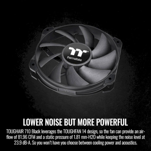 Toughair 710 використовує конструкцію Toughfan 14, тому вентилятор може забезпечити повітряний потік 81,96 CFM і статичний тиск 1,81 мм-H2O, зберігаючи водночас рівень шуму на рівні 23,9 дБ-А. Отже, вам не доведеться вибирати між потужністю охолодження й акустикою.