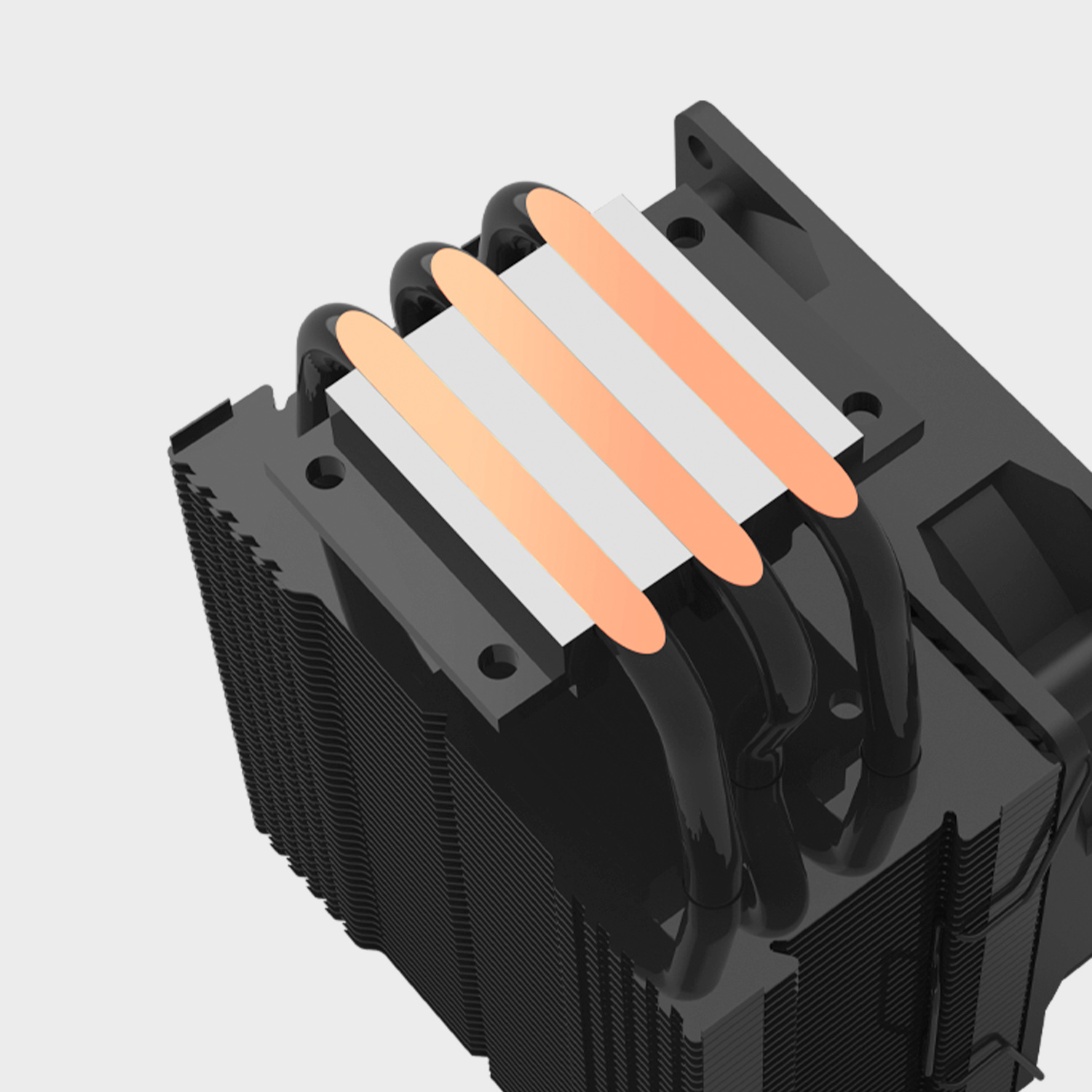 Три точно виготовлені мідні теплові трубки щільно прилягають до процесора, рівномірно поглинають тепло і швидко його розсіюють.