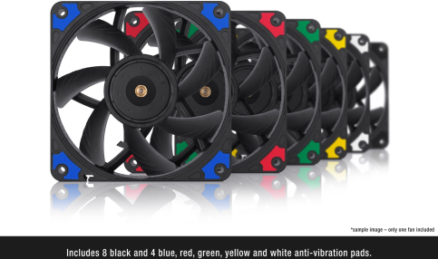 Chromax.Black.Swap включає 8 змінних антивібраційних прокладок у шести кольорах (чорний, білий, червоний, синій, зелений, жовтий), що дозволяє налаштувати вигляд вентилятора під стиль вашої збірки. Модульна кабельна система з чорним 30-см кабелем NA-EC1 і додатковими кольоровими кабелями (продаються окремо) забезпечує охайну прокладку. Комплектація включає вентилятор, 8 прокладок для кожного кольору, кабель та 4 гвинти.
