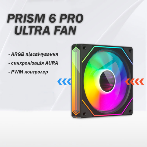 Вентилятори серії Prism 6 Pro можна використовувати для радіаторів водяного охолодження 120 / 240 / 360 мм як кулер для процесора, радіатора графічного прискорювача і, звичайно ж, як унікальна система охолодження для комп’ютерного корпусу. Вентилятор оснащений прохідним роз’ємом живлення та керування обертами 4 Пін PWM, та прохідним роз’ємом підсвічування ARGB 3 Пін 5 В. Вентилятори можна з’єднувати між собою послідовно і не використовувати для їх з’єднання окремий хаб чи контролер. ARGB підсвічування вентилятора підтримує синхронізацію з технологією ASUS AURA Sync, MSI mystic light sync, Gigabyte RGB Fusion та інших популярних виробників материнських плат.
