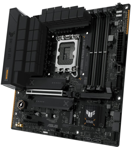 Asus TUF Gaming B760M-Plus II — материнська плата із підвищеним рівнем надійності. Використовує всі необхідні елементи новітніх процесорів Intel і поєднує їх із функціями, готовими до ігор, і перевіреною довговічністю. Розроблена з компонентами військового класу, оновленим рішенням для живлення та комплексною системою охолодження, тому перевершує всі очікування завдяки надійній продуктивності для марафонських ігор.