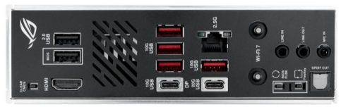 Екран вводу/виводу та радіатор M.2 мають перфоровану металеву сітку, яка може або відбивати світіння внутрішніх компонентів RGB, або плавно зливатися з тінями прихованої конструкції. Текст у кібер-стилі та чіткі кутасті деталі підтверджують цю материнську плату членом сімейства ROG Strix.