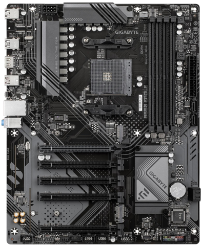 Gigabyte B550 EAGLE — материнська плата формфактора ATX, призначена для встановлення процесорів AMD, які сумісні із сокетом B550. Підтримує оперативну пам'ять DDR4, для планок передбачено 4 слоти з можливістю встановлення до 128 ГБ. Має всі необхідні роз'єми для встановлення накопичувачів швидкісного типу, відеопорти для підключення мультимедійних пристроїв.