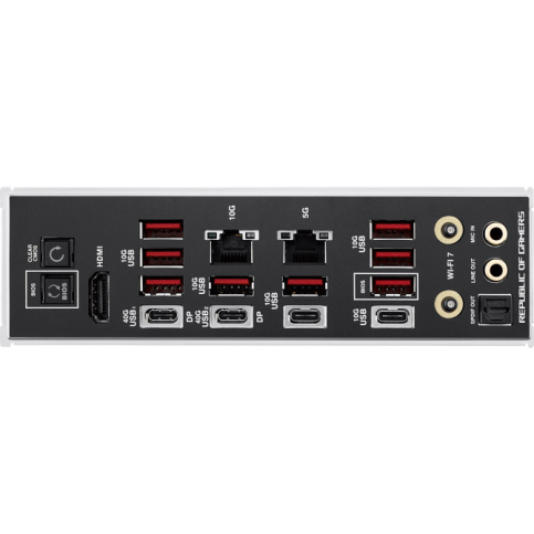 Порти на задній панелі: 1 × HDMI, 2 × USB4 (40 Gbps), 2 × USB-C 3.2 Gen 2, 8 × USB 3.2 Gen 2, 2 × LAN (RJ-45), 2 × аудио, 1 × S/PDIF (оптический)