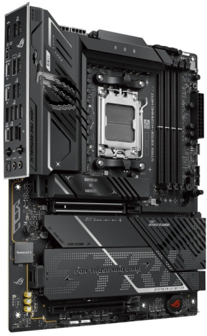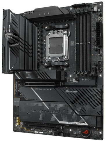 Материнська плата оснащена роз’ємом AM5 для новітніх процесорів AMD Ryzen і підтримує пам’ять DDR5. Для зберігання даних передбачено чотири M.2 слоти, два з яких підтримують PCIe 5.0 x4, що забезпечує блискавичну швидкість для NVMe-накопичувачів. Система охолодження включає теплові пластини для M.2 і масив тепловідводів для VRM, що ефективно розсіюють тепло під час інтенсивної роботи. AI Cooling II автоматично оптимізує роботу вентиляторів, знижуючи шум і підтримуючи низькі температури.