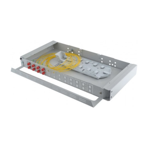 Панель складається з сталевого корпусу з кришкою і поворотною передньою панеллю. Поворотна панель відкривається зліва, забезпечуючи доступ до сплайс-касеті без демонтажу з стійки. На передній панелі є 24 посадочних місця для установки адаптерів типів FC.